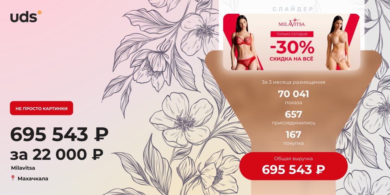 Реклама в UDS App — это не просто картинки, а рабочий инструмент для роста. Компания Milavitsa разместила красочный слайдер на главной странице приложения и увеличила выручку в 31 раз от вложенных средств. Рассказываем, как это повторить.